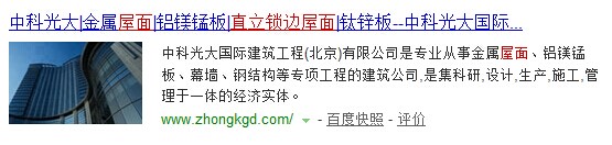 經(jīng)過多日努力,中科光大的關(guān)鍵詞直立鎖邊屋面、直立鎖邊屋面系統(tǒng)在百度自然排名36位,希望同志們在努力一把,把關(guān)鍵詞做到首頁,謝謝啦!