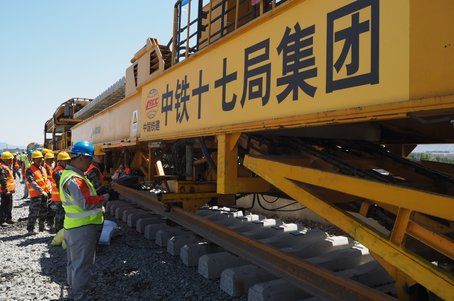 6月1日上午,位于山西天鎮(zhèn)火車站的大張高鐵施工現(xiàn)場,鋪軌機將首對500米長軌安全平穩(wěn)地鋪設(shè)