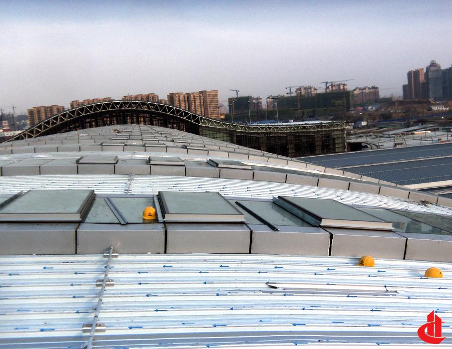 玻璃采光天窗高低跨弧形造型,并設(shè)有電動(dòng)消防排煙系統(tǒng);雨棚為大跨度弧形屋面系統(tǒng),設(shè)有防水鎖扣