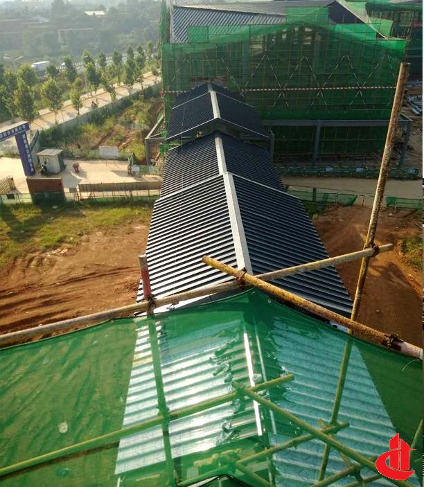 金屬屋面由多個不規(guī)則的三角形拼接而成,屋面面積約1100m2, 屋面包含金屬屋面系統(tǒng)、