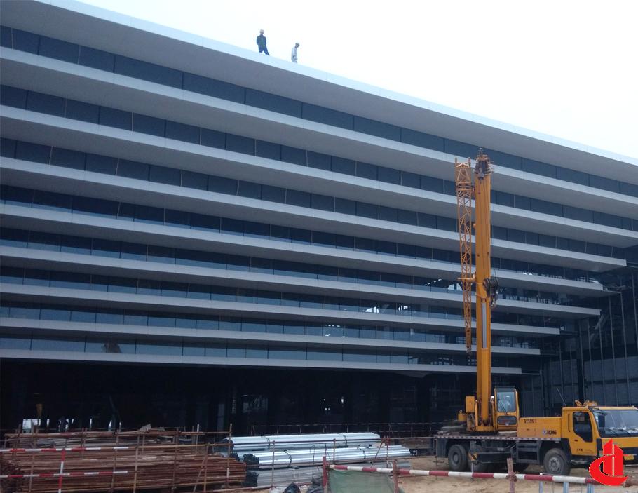 石材幕墻面積4975m²,鋁板幕墻面積12610m²,玻璃幕墻5040m²,鋁合金裝飾條400m²,