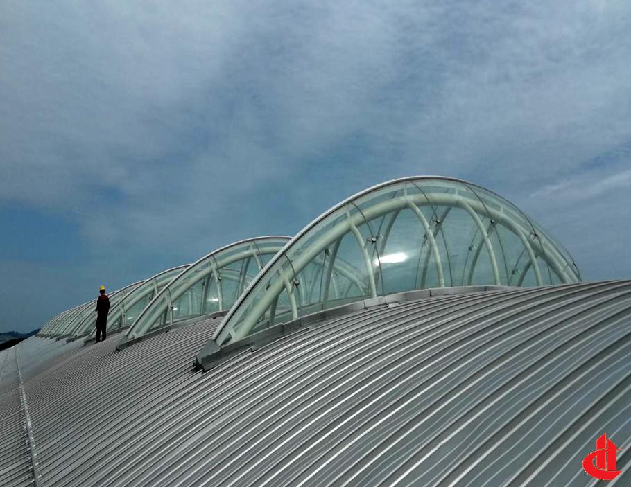 屋面主檁條彎弧,屋面板彎弧、天溝電伴熱系統(tǒng)、雙曲采光天窗玻璃是本工程的重點(diǎn)及難點(diǎn)。