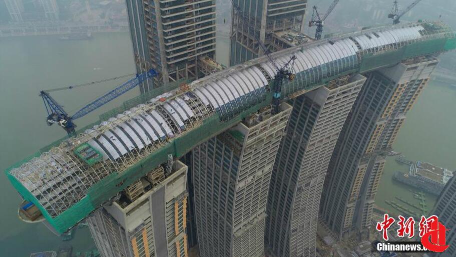 ? 圖為正在施工中的“空中連廊”?!∈茉L者供圖 攝 中新網(wǎng)重慶1月14日電 (記者 鐘旖)14日20時許,隨著最后一塊幕墻單元體在重慶來福士 被提升至2...